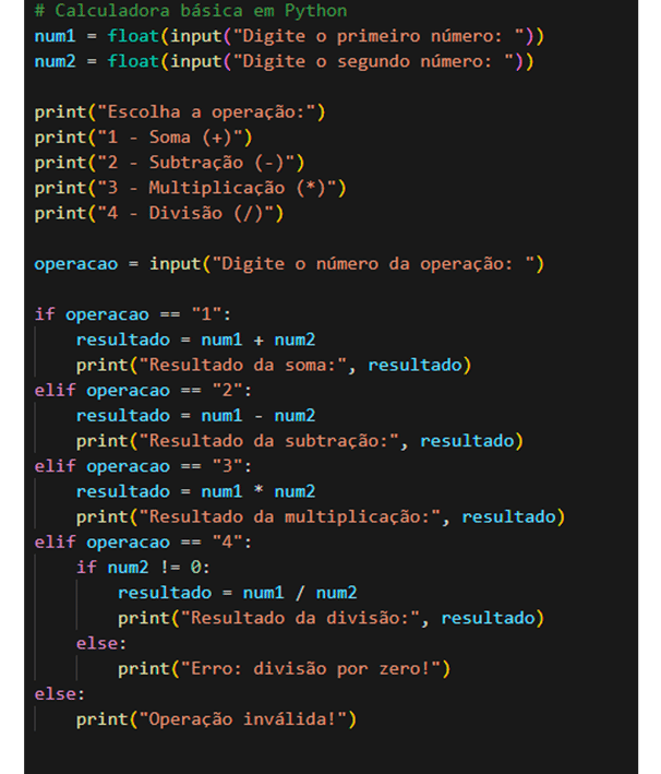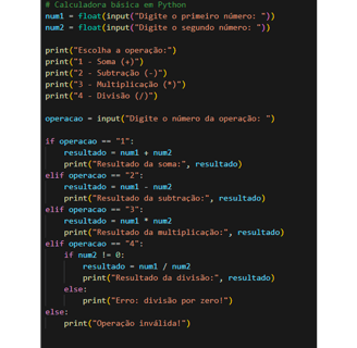 A calculadora pede ao usuário dois números e uma operação, e exibe o resultado da operação escolhida.